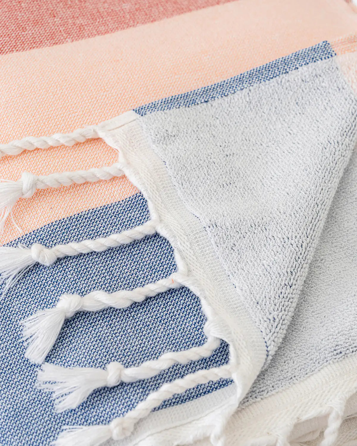 With its pastel tones and soft texture, it offers comfort for beach and pool use. With its high absorbency, it provides quick drying after the sea or pool while its lightweight structure makes it easy to carry throughout your vacation. The high-quality cotton fabric leaves a light and fresh feeling on your skin.